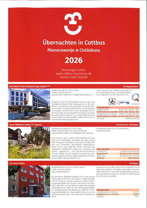 Broschüre (A4) Hotels, Pensionen, Ferienwohnungen und -häuser, Privatzimmer und Caravanplätze für Ihren Cottbus-Aufenthalt